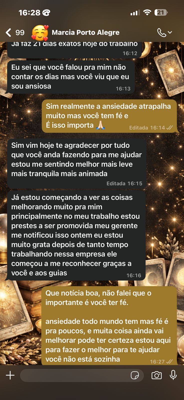 A consulta espiritual é realizada de forma online, com total sigilo e responsabilidade. Durante o atendimento, realizo uma análise profunda da sua situação para oferecer a melhor orientação espiritual.