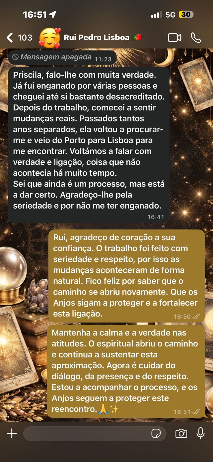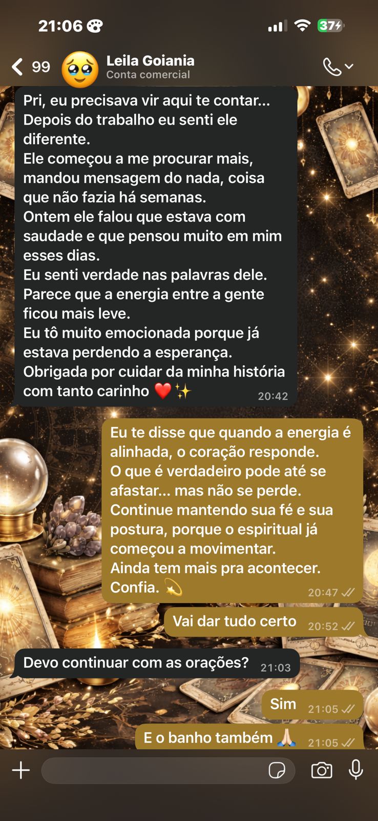 Atendimento espiritual sério e sigiloso para quem busca respostas no amor, na reconciliação e no fortalecimento energético. Cada caso é analisado individualmente antes de qualquer direcionamento espiritual.