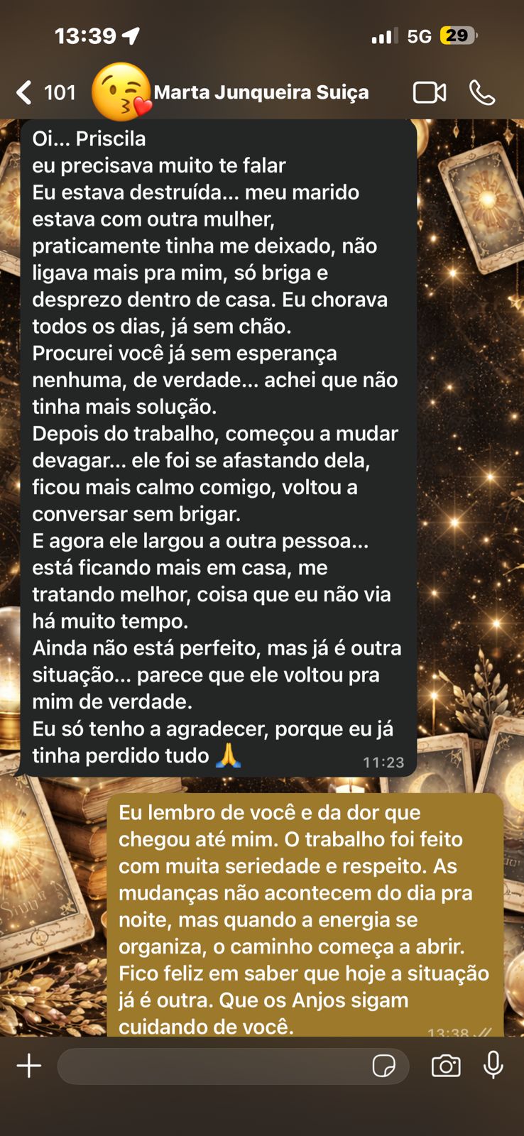 Cartomante Priscila atua na área espiritual com foco em relacionamentos, reconciliação amorosa, fortalecimento de vínculos e limpeza energética. Com mais de 7 mil atendimentos realizados, seu trabalho é voltado para a análise profunda de cada situação, identificando bloqueios, interferências espirituais e desequilíbrios que impactam diretamente o campo emocional e afetivo.