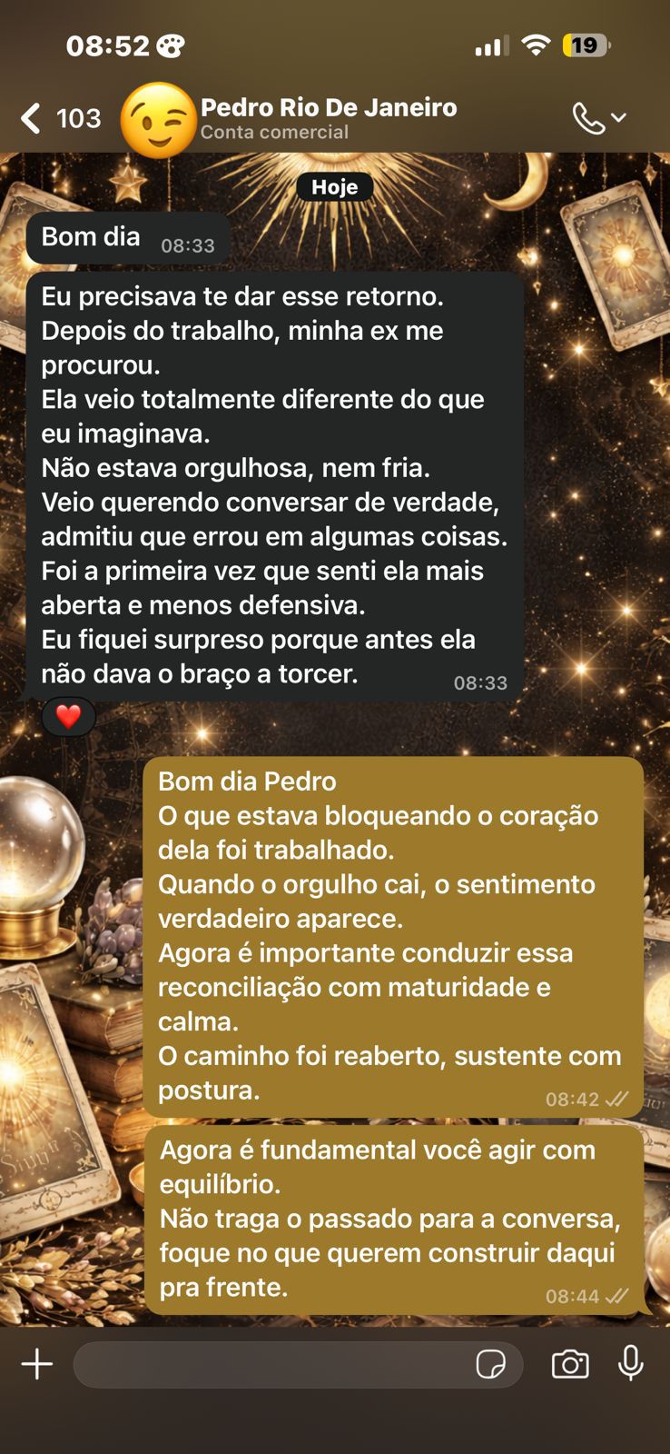 A consulta é realizada de forma online, com análise energética da sua situação, identificação de interferências e orientação clara sobre os caminhos possíveis para seu relacionamento.
