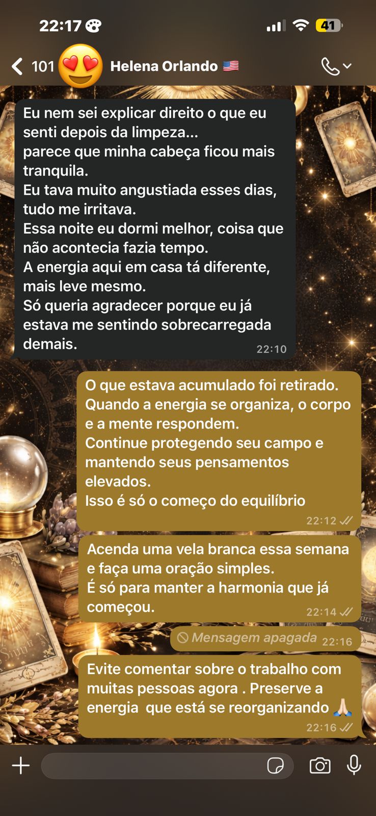 O atendimento é 100% online, disponível para todo o Brasil e também para brasileiros no exterior, sendo conduzido com sigilo absoluto, total discrição e análise energética personalizada, respeitando a história e a necessidade de cada consulente.
